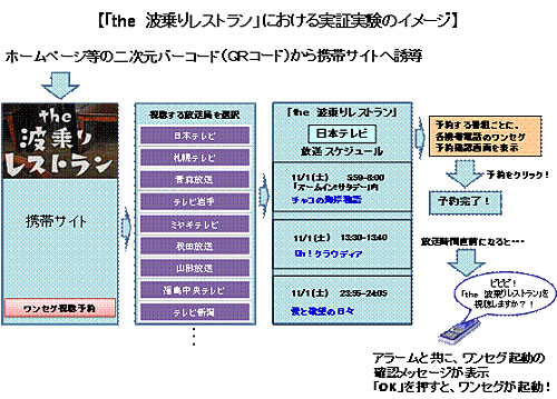 実験では、「the波乗りレストラン」の携帯サイトで、まず居住エリア(視聴エリア)を選択し、観たい番組の視聴予約を行うと、ワンセグ搭載の携帯電話の「ワンセグ起動スケジュール機能」に登録されます。放送開始時間の直前になると、アラームと共にワンセグ起動のメッセージが表示されるため、視聴者は身近な携帯端末で「見逃し」なく番組を視聴することができます(※対応機種:NTTドコモのワンセグ携帯電話 及びauの一部ワンセグ携帯電話)。