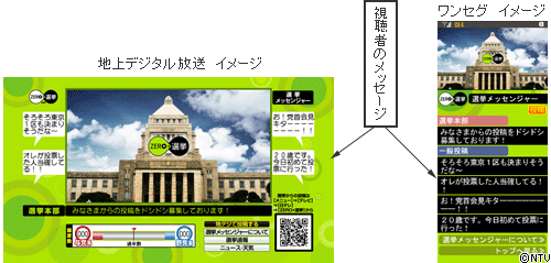 メッセージは(1)地上デジタル放送※1、(2)ワンセグ、(3)携帯サイト「MY日テレ」の選挙特番ページ、のいずれかから18文字以内で投稿できます。最新の投稿を優先的に、公序良俗に反する内容等が含まれていないかを確認後、地上デジタル放送およびワンセグのデータ放送領域に最大4つが同時に表示されます。日本テレビ側からも、適宜、選挙に関する情報やコメントを表示します。