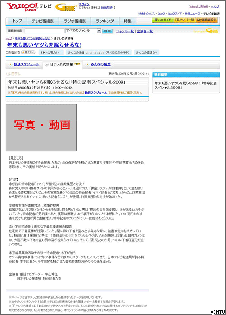 細川 知正、以下 日本テレビ)は、ヤフー株式会社(以下 Yahoo! JAPAN)の運営する「Yahoo!テレビ.Gガイド」に対して、12月24日(木)より「日テレ公式情報」の配信を始めました。