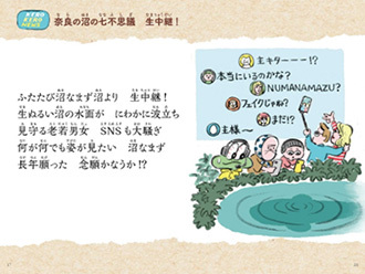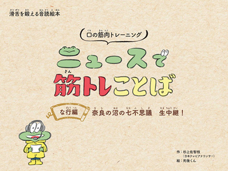 長引くマスク生活により大人も子どもも口周りや表情が硬くなりがちです。今回も滑舌に着目し、舌や唇、その周りの筋肉のトレーニングにつながる言葉を“筋トレことば”と命名し、言いづらい “筋トレことば”をたくさん盛り込んだ絵本の第2弾を絵本ナビと共同で制作。前回の「さ」行編に続き、今回は「な」行の言葉をたっぷり詰め込んだ『「ニュースで筋トレことば」な行編 奈良の沼の七不思議 生中継!』を絵本ナビと共同で制作しました。