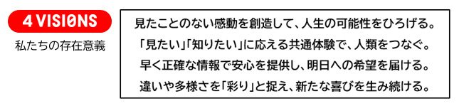 日本テレビは、70年の歩みから日本テレビが大切にする価値観と未来像を社内そして社外のみなさまと広く共有するべく、私たちの存在意義としての「4VISIONS」、そして新たにコーポレートメッセージ「心と未来に、のこるもの。」を策定いたしました。