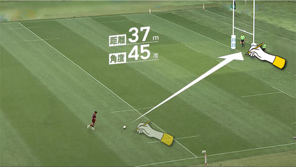 - 競技場の白線を画像解析することで、プレイエリアの平面をリアルタイムで認識できます。これにより、従来では計測が難しかった、ゴールと選手との距離、角度、速度を簡単に表示できるようになり、コンテンツに付加価値をもたらすことができました。(写真2参照)