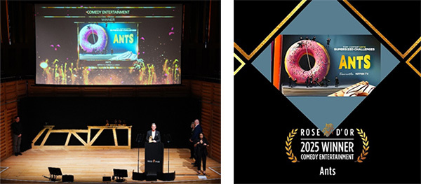 上段左から、『ANTS』海外フォーマット・キービジュアル、アリに扮して巨大なお菓子を運ぶ参加者たち下段左から、イギリス・ロンドンでの授賞式にて『ANTS』受賞発表の様子、受賞を報じた「ローズ・ドール賞」の公式SNS