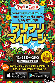 朝の情報番組「PON!」の放送中に、「憧れのハワイ旅行を目指して、みんなでフリフリマイレージを貯めよう!そして、ラッキーな方には島田秀平の2014年開運壁紙をプレゼント!」ということで、視聴者の皆様の参加でプレゼントの旅行先がグレードアップする「フリフリマイレージ」企画を実施します。また、12月26日(木)には、「PON!-1グランプリ チャンピオン大会」でフリフリ投票企画も実施します。