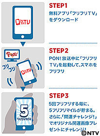 日本テレビ放送網株式会社(本社:東京都港区、代表取締役 社長執行役員:大久保好男、以下 日本テレビ)は、テレビとスマートフォンをつなぐ新しいインターフェイスとして、新アプリ「フリフリTV」を12月19日(木)から、無料で提供いたします。