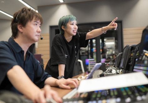 この日はコントロール卓だけでなく、カンペを出したり、スタジオを仕切るフロアディレクターも担当。卓のディレクターとインカムで話したり、カメラマンと動きを確認したり、アーティストご本人とも向き合います。収録の盛り上がりが最高潮になるように…観覧のお客さんへの前説にも気合が入ります!