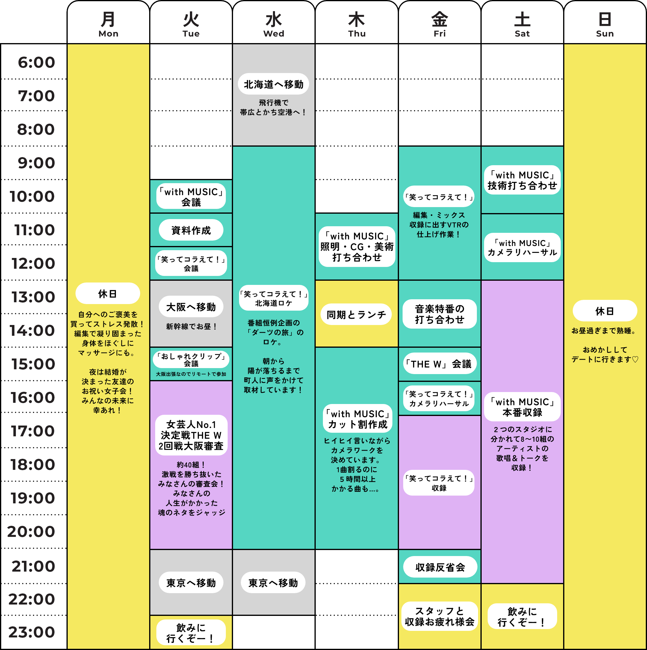 自分の仕事やアイディアが日本中に放送され、その反応がわかりやすい形で返ってくること。「笑ってコラえて!」ではどうやったら面白くなるか頭をフル回転させながらロケをして、編集して、ナレーションを熟考して作り上げたVTRで、スタジオの所さんが大爆笑してくださったとき。「with MUSIC」「THE MUSIC DAY」「THE DANCE DAY」では音楽やダンスの力を借りて、そこに自分なりの演出を加えて、心に響く感動的な瞬間を生み出せたとき。「おしゃれクリップ」では自分が作ったVTRやギミックで、ゲストが涙を流して喜んでくださったとき。全部心の中でガッツポーズしています!