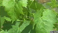 日盛りに、裏庭のブドウの手入れをする。