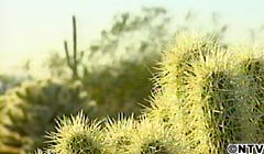AD日記〜フランク・ロイド・ライト(2)(2006/1/25放送)〜 私にとって初海外となった今回のアメリカロケ。そんな私が描いていたアリゾナのイメージはどこまでも続く広大な砂漠、そしてその砂漠に生えるサボテン…。正にその通り!いや、それ以上!予想以上に高く伸びたサボテンは家の庭や山にも所構わず生えていたり、某有名遊園地のアトラクションを彷彿させるゴツゴツした巨大な岩山。アリゾナの風景に仕事を忘れ見入っていた私がディレクターに怒られたのは言うまでもありません。 そんな砂漠の真ん中で異彩を放つ建物群「タリアセンウエスト」。 ライトがなんと70歳のときに「この砂漠に理想郷を建てよう」という事で弟子を引き連れテントで生活しながらの建設、そのパワーには恐れ入りました。ここでは今でも学生が建築を学んでいて、1年生はテント生活が義務です。 “建設者達の苦労、忘れるべからず”と言ったところでしょうか。 |