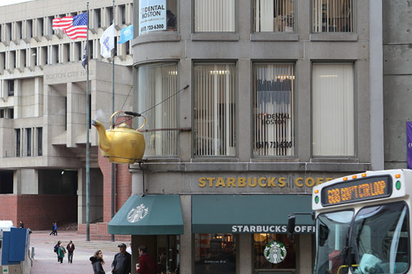 ボストンでは、印刷物やおみやげのパッケージなど、さまざまな場面でティーポットのモチーフに出くわします。これは有名な「ボストン・ティー・パーティ」(日本語では「ボストン茶会事件」)にちなんだデザインです。