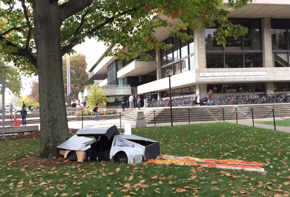 おまけ:MITの屋外に展示された(?)、火花が尾を引くポンコツデロリアン。新手のアート作品か!?