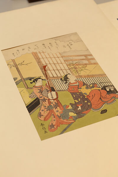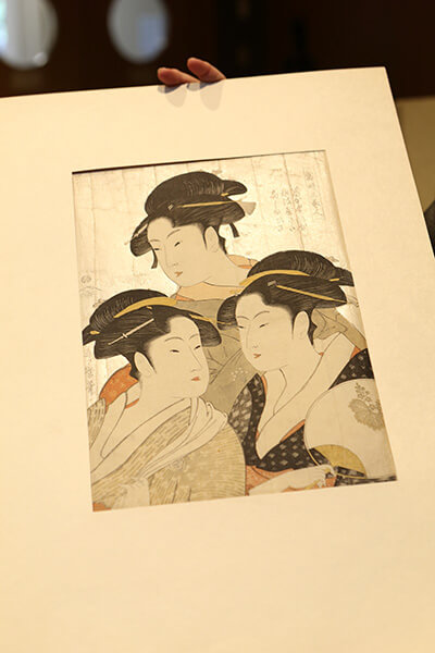 三人娘のバックの雲母(きら)摺りがきれいに残っているため、少し傾けると光を反射してキラキラ光ります