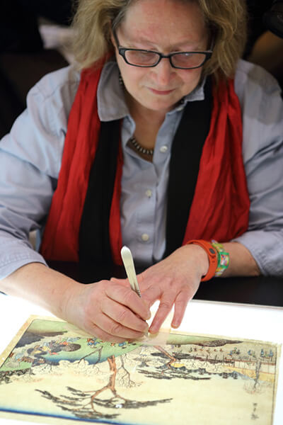 医療用のメスを使って、浮世絵の虫食い部分を修復中のジョーン・ライト女史。