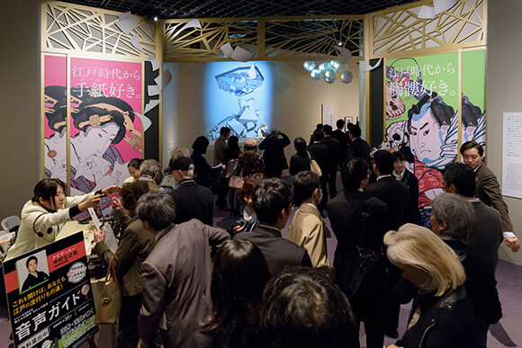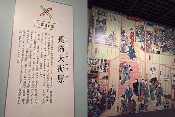 「浮世絵は江戸の人々が求めたエンターテインメントを凝縮したメディアである」という展覧会のコンセプトから、章立ても歌舞伎のタイトルに倣ってポップなものに。作品を大きく引き伸ばしたパネルが、会場の雰囲気を盛り上げます。