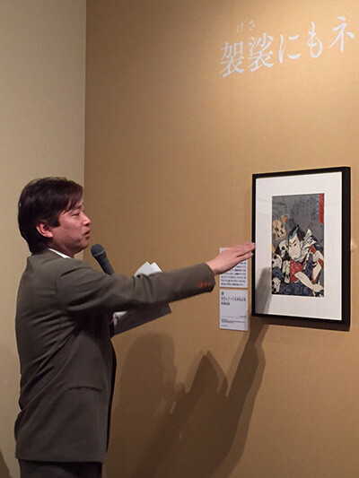 内覧会では、展覧会の監修者・松嶋雅人先生が展覧会や作品について解説。「武者絵や戯画で人気を博した国芳の浮世絵は、義理人情に篤い江戸の男たちが熱く語り合ったはず。また国貞の役者絵や美人画は、女性がひとり静かに眺めて、次に出かける時のファッションや化粧の参考にしたのかもしれません」
