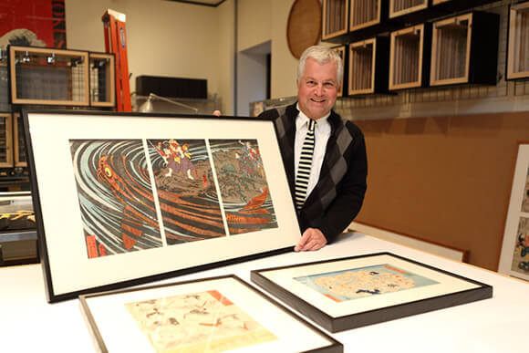 会場では、すぐに見分けやすいように、国芳作品を黒い額装で、国貞作品を茶色い額装で展示しています。額装を担当したのは、ボストン美術館のジョン・ロビー氏。日本に来ると必ず東急ハンズに寄り、額装に必要な刷毛やブラシを買って帰るのが楽しみなんだとか。アメリカでは見たこともない道具がたくさんあって、とても興味深いのだそうです。
