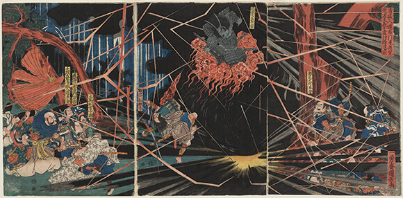たとえば、何度かご紹介してきた日本のマンガの原点《荷宝蔵壁のむだ書》はもちろんのこと、《清盛入道布引滝遊覧悪源太義平霊討難波次郎》などの表現もマンガそのもの。平清盛一行が布引の滝で源義平の悪霊に襲われる場面を描いた本作では、激しい閃光がまるで昭和の劇画のように画面を縦横無尽に走ります。