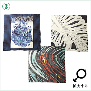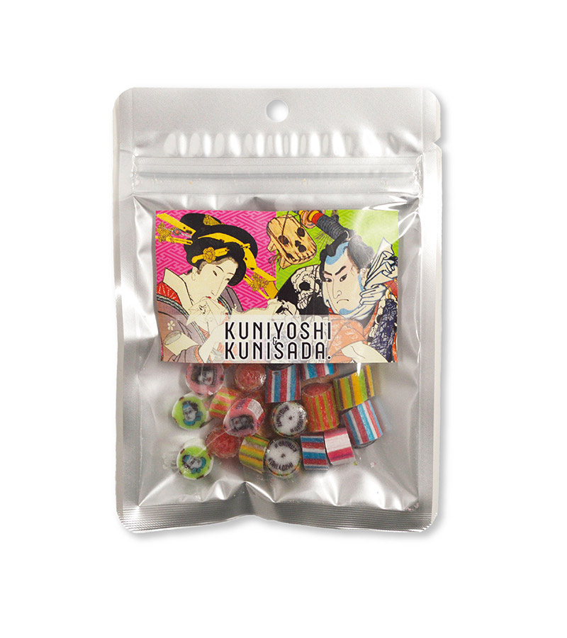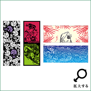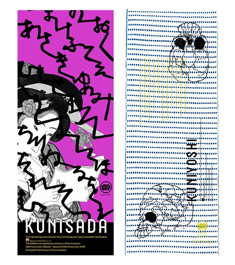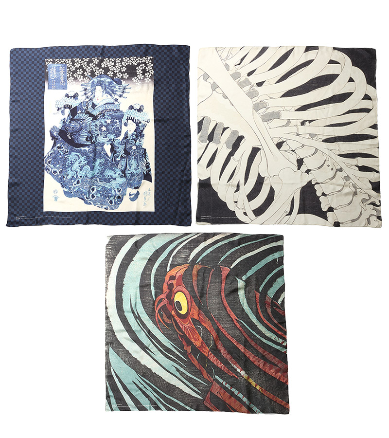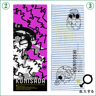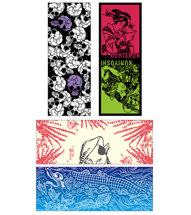 浮世絵にも登場する当時の歌舞伎役者が好んで愛用していた今や全国で一軒しか作ることができない豆絞りに歌川国芳「国芳もやう正札附現金男 野晒悟助」の猫スカルプリントを施したスペシャルな手ぬぐいができました。この他、歌川国貞「当世三十弐相 よくうれ相」の手ぬぐい、国芳・国貞の風呂敷が登場!