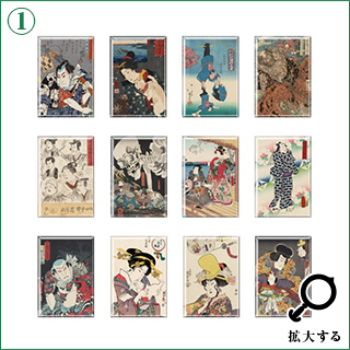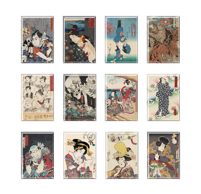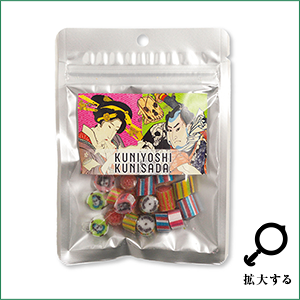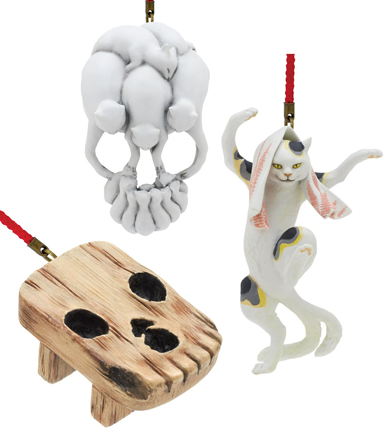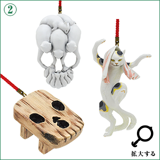 国芳・国貞の作品から至極の12種類をセレクトした高級感漂う美しいマグネット。そして、歌川国芳「国芳もやう正札附現金男 野晒悟助」より、着物に描かかれている猫の寄せ絵の髑髏“猫骸骨”と刀に付いている下駄“骸骨下駄”。「見立東海道五拾三次岡部 猫石の由来」の化猫“踊る猫又”の3種類を根付として立体化!