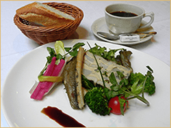 - 展覧会開催記念メニューとして、江戸の庶民に親しまれていた穴子とフレンチの食材のフォアグラをテリーヌに仕上げました。穴子のソテーを添えた食べ応えのある一皿です。