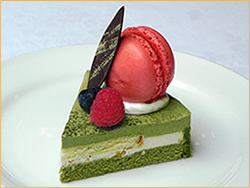 抹茶のジェノワーズとムースの香り豊かな優しい味わい、甘酸っぱいフランボワーズのマカロンがアクセントになっています。