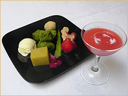 - 海外に渡った日本の浮世絵が再び来日する本展をイメージして、和洋コラボのスイーツを考案しました。本展のテーマカラーをアクセントにしています。抹茶のわらび餅ときなこ団子、芋羊羹の和スイーツをバニラアイスとソーテルヌを効かせた苺のスープと共にお召し上がり下さい。