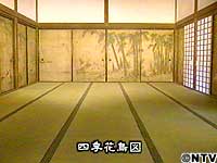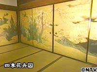 ![]() 隣室の「四季花鳥図」は、渋さと落ち着きの中、金箔が鳥の羽一本一本の中にほどこされ、驚くような繊細さを見せてくれます。