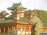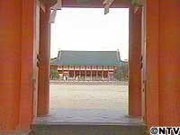 ![]() 古の時代を偲ぶ、壮大な門をくぐると、そこは華やかな王朝絵巻の世界。鮮やかな朱の社殿が、朝日を浴びて目映いばかりの光りを放っています。