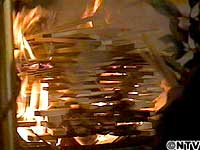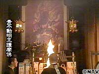 ![]() 毎月、満月の日に行なわれる護摩(ごま)焚き。 古来より、いくつもの願いを受け止めてきた青不動明王(あおふどうみょうおう)の勇壮な姿が、炎の奥に浮かびます。