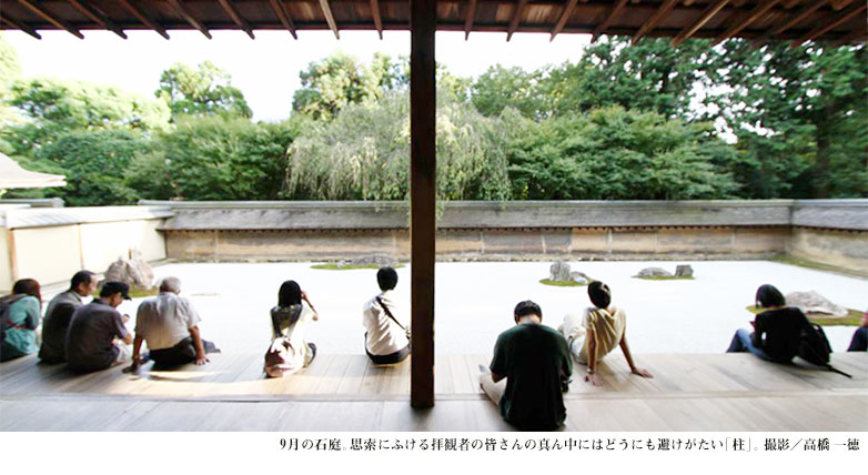 —— 皆さん、それまでに龍安寺に行かれたことはあったのですか?| 甲斐 | 龍安寺ってどんなところなんだろうねということで、技術陣は皆それぞれ休みとったり、自費だったりで、京都までリサーチに行きました。で、石庭に行ったら、おーっと、石庭に面した縁側のこんなところに「柱」があるのかと(笑)。想定のイメージでは柱は考えてなかったんですが実際には柱がありまして。 |
