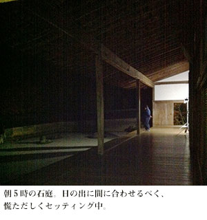 2012年11月28日、紅葉の石庭の本番撮影に同行取材させてもらう。朝4時半過ぎ、龍安寺に到着。真っ暗な石庭を前に、撮影スタッフは手慣れた様子で照明を点けて、板戸を外し、畳の上に養生を敷き、カメラ台を据え付け、撮影のセッティングを着々と進めていく。寺院が寒いということは聞いていたので、冬用の靴下を2枚重ねで穿き、足用の使い捨てカイロを靴下の裏に貼った。だが、板の廊下に温度を奪われて一向に暖かくならず、そのうち足の裏の感覚がなくなり始めた。