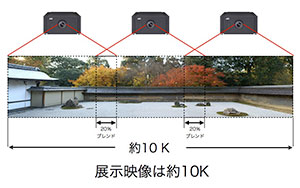 今回の展覧会の映像は、図のように、3つの「4K 」の映像を横に並べて3台のプロジェクターで投影します。横方向の画素数は、単純に3倍にすれば、4K ×3=4,000×3=12,000画素ということになりますが、実際には繫ぎ目を消すために、隣り合う映像を約20%ずつ重ね合わせる「ブレンド処理」を施し、横方向の画素数はトータルで9,984画素。つまり、4Kを超越した約10Kの映像ということになります。