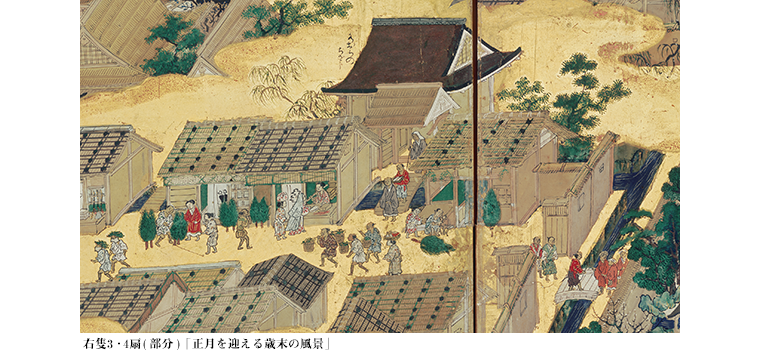 画面中ほどの小川通では、門松を作る年男が箸を使ってその先端に歳玉(餅)を供えるしぐさが事細かに描かれているなど、民俗的な資料としても興味深く、若き永徳の細密表現の技量の高さにも目を奪われます。