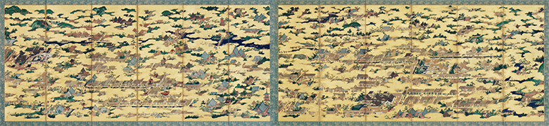 米沢藩主上杉家に伝わったもので、洛中洛外図の中でも最高傑作とされます。将軍足利義輝が日本を代表する絵師のひとり狩野永徳に描かせたもので、永禄8年(1565)に完成し、義輝没後に織田信長が入手して、上杉謙信へ贈ったと考えられています。将軍家と関わりの深い相国寺の七重大塔から眺めた景観を描いたともいわれ、金の雲間から尖った屋根をのぞかせる表現が特徴的です。貴族、武家の邸宅や寺院など京都のランドマークが数多く描かれ、登場人物も老若男女2500人近くにのぼり、重厚な金雲のあしらいや自然や建物の色感は華やかで、見る者に圧倒的な印象を与えます。