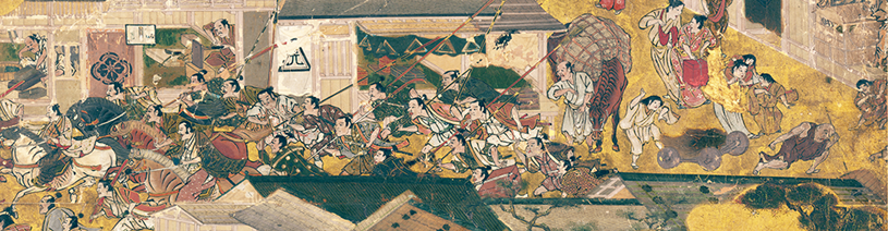 はじめに、天下人が覇を唱えた時代の人々の暮らしを、京都市中と郊外の数々の名所とともにつぶさに描き出す「洛中洛外図屏風」によって、当時の都の全体像を俯瞰します。本展では、国宝、重要文化財に指定される7件すべてが一堂に会します。祭り囃子の音色が聞こえてくるような画面には、生き生きとした人々の姿と、四季の景観が鮮やかに描かれています。さらに「洛中洛外図」には、京都を支配した人々の都へのまなざしが色濃く反映されています。「洛中洛外図」の名品の数々によって、当時の天皇の権威や、武士、寺社の勢力がどのようにあらわされているかを知ることができるのです。