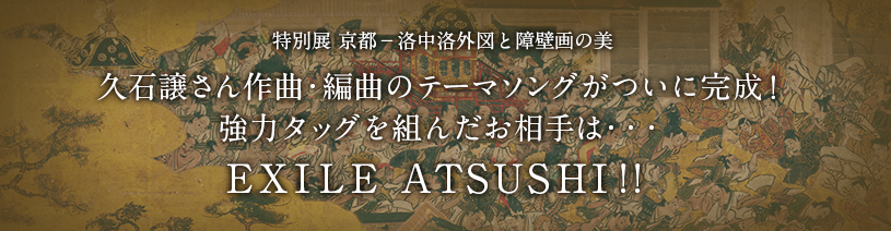 いよいよ10月8日(火)に、上野・東京国立博物館にて開幕する、日本テレビ開局60年特別美術展 特別展「京都―洛中洛外図と障壁画の美」。 国内外で広く活動を行う、作曲家の久石 譲さんの作曲・編曲による、本展の公式テーマソングが完成しました。 このテーマソングを作詞し、歌うのは、EXILE ATSUSHIさん。2人がタッグを組むのは、これが初めて。 曲のタイトルは、「懺悔(ざんげ)」。本展で公開される、重要文化財の「洛中洛外図屏風 舟木本」を鑑賞した2人が、 この絵にインスパイアされ、制作期間2か月以上を費やし、一心同体となり完成させた渾身の楽曲となっています。 楽曲完成を受け久石さんは、「ATSUSHIさんと一緒に洛中洛外図を鑑賞して、単に昔の絵を見るということではなく、今の視点から解釈した。 やった事のないチャレンジだったが、予定調和でない化学反応をATSUSHIさんと残せた。」一方、ATSUSHIさんは「初めての事に挑戦するのは困難な事かもしれないけれど、 久石さんという方は絶対だという気持ちがあったので、そこに踏み込む勇気さえあれば、必ずいいものができるという確信はあった。」と語りました。