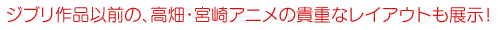「風の谷のナウシカ」「天空の城ラピュタ」「となりのトトロ」「おもひでぽろぽろ」「紅の豚」「平成狸合戦ぽんぽこ」「耳をすませば」「もののけ姫」をはじめ、「千と千尋の神隠し」「ハウルの動く城」、そして「崖の上のポニョ」まで、様々な名場面のレイアウトが今回、スタジオジブリ・ジブリ美術館の協力を得て展示可能となりました。