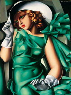 モデルはレンピッカの娘、キゼットである。この作品においてキゼットは初めて官能的で、意気揚々とした姿で描かれている。緑のドレスは背後ではためき、身体をぴったりと包み、乳房とへその形をあらわにしている。優雅な帽子と手袋をつけた彼女は、究極の女性らしさを体現している。レンピッカは自分自身の若い頃を思い出し、過去の自分を投影し描いたに違いない。つまり、この作品は自画像でもあるのだ。なお、この作品は彼女の最高傑作の一枚として世界の美術館で展示されている。(E・B)