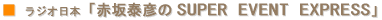 言葉の魔術師、赤坂泰彦が贈るイベント情報ラジオ番組。日本テレビが主催する様々なイベントの見所から、舞台裏事情、出演者たちの意気込みや、ラジオだからこそ聴ける“ここだけの話”などトークの天才、赤坂がズバリ斬ります。