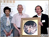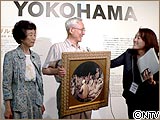 | めでたく50万人目の入場者となった横浜市港北区新羽町在住の山村庄亮(やまむらしょうすけ)さん(70歳)は、展示室前において、横浜美術館雪山行二館長から、アングル作《トルコ風呂》の複製画と展覧会オリジナルカタログの記念品が贈呈されました。 |