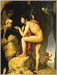 | 世紀初頭に隆盛を誇った新古典主義は、ナポレオンの失脚の後、その主導者ダヴィッドがベルギーに亡命し、急速に勢いを失わざるを得ませんでした。その後退を食い止め、再興させたのがアングルでした。ダヴィッドの新古典主義的絵画が厳格、現実的で男性的であったとすれば、アングルのそれは、師の様式を基本的に踏襲しつつも、優美、空想的で女性的な要素を取り込んだ斬新さがありました。アングルは型にはまりがちであった新古典主義に、ロマン主義との格闘の中で得られた新しき息吹を吹き込むことによって、それを再生させたのです。 |