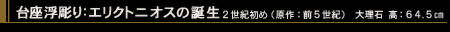 | アテネ建国伝説では第4代の王とされるエリクトニオスの誕生を語る貴重な浮彫り。アテネのアゴラ(広場)のヘファイストス神殿に祭られていたヘファイストス像の台座浮彫り(アルカメネス作)をローマ時代に模刻した作品で、上半分はさらに後補。アルバーニ・コレクションから1798年にナポレオンが接収してルーヴルのコレクションとなった。アフロディテ(ローマ神話ではヴィーナス)の夫・鍛冶の神ヘファイストスはアテナと交わろうとして争いとなり、誤って大地の女神ガイアをはらませてしまった。こうして生まれたのがエリクトニオスで、アテナに保護されてアテネの王となった。中央でガイアが半身を地中から出してエリクトニオスをアテナに捧げ、向かって左の男性はヘファイストス、右の女性はアフロディテとされる。 |