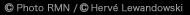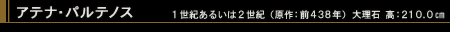 | 通称《首飾りをつけたミネルヴァ》。アテネ・アクロポリスの丘のパルテノン神殿に設置されていたアテナ・パルテノス像のローマ時代の模刻で、ローマの大コレクター、ボルゲーゼ家のコレクションにあったが、1807年にナポレオンが購入した。前438年に奉納されたフェイディアスの原作は、黄金と象牙で作られた高さ約12mの立像で、様々な模刻から類推すれば、正面向きで、兜をかぶり、胸板を付け、左肩に槍を立てかけ、左手で盾を支え、右手で勝利の女神ニケを差し出す姿であったと推定される。この原作は5世紀にパルテノン神殿がキリスト教会堂に改装された際におそらくコンスタンティノポリスに運ばれて、その後の消息は不明。本作はその六分の一の模刻と推定される。《アルルのヴィーナス》と同様に、17世紀には当時の趣味によって欠損部分が修復・捕刻されていたが、20世紀初頭に取り外されて現在の姿となった。 |