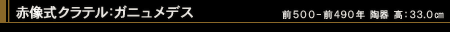 | 「最も美しい少年」と称されたトロイアの王子ガニュメデスは、ゼウスの放った(あるいはゼウスの化身の)鷲によって天界に運ばれて、美童として神々の酌を務めることになる。ここでは、まだ地上にいるガニュメデスが裸体で無心に輪遊びをしている姿が描かれているが、手に持つ鶏には恋の贈り物の意味があり、この裏面にはゼウスが描かれているから、神と少年のドラマはすでに始まっている。高さも直径も33cmという独特な形のクラテル(ワインと水を混ぜる容器)にこれを描いた作者は、その代表作の所在地から「ベルリンの画家」と呼ばれ、前5世紀前半を代表する赤像式の画家。雷門などの水平帯上に、枠組みなどを取らずに、必要最小限の繊細な描線で、曲面に人物を的確に描き出す技量はすばらしい。 |