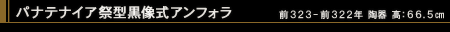 | パナテナイア祭はアテナ女神の大祭典で、アテネの1年の第1月ヘカトムバイオン(現在の7月−8月)の28日から開催された。この日はアテナの誕生日とされる。このタイプのアンフォラ(本来はワインなど液体を貯蔵する容器だが、墓標にも使用された)は、パナテナイア祭の競技の優勝者にオリーヴ油を入れて贈られたもので、一面にアテナ女神を描き、その裏面に優勝者の競技種目が描かれた。前540年頃に規格化されて、前500年頃に陶器画の技法が黒像式(黒絵式)から赤像式(赤絵式)に転換した後も、特別なアンフォラとしてこの規格と技法が維持された。また、前4世紀には、パナテナイア祭開催年のアルコン(執政官)の名が記され、しかもアルコンは1年任期なので、制作年が特定できる貴重な作品群である。 |