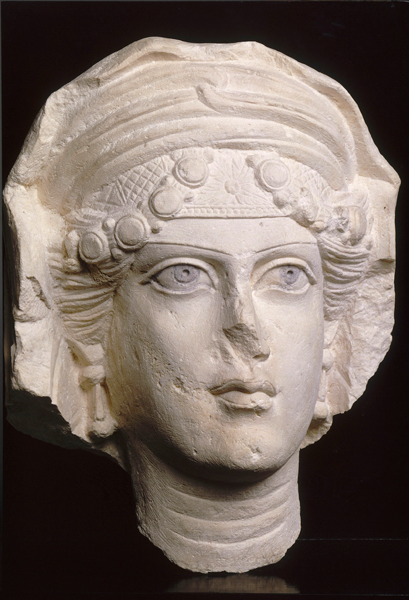 シリア砂漠の中央に位置するパルミラは、紀元前1世紀から紀元後3世紀にかけて、地中海のローマ帝国と西アジアのパルティア王国(前247頃-228)の交易を結ぶ隊商都市として栄えました。パルミラの遺跡では、ローマ帝国に支配された時代(1-3世紀)の地下墓所がいくつか発掘されています。墓所には、矩形にくりぬかれた墓室のなかに石棺が安置され、墓室の蓋は死者の肖像彫刻で、また石棺の上面や側面は墓を作った一家の群像彫刻で飾られました。こうした彫像はローマ美術の影響を受けて、立体感のある高浮き彫りの手法で制作されています。一つひとつ微妙に表情が異なるため、故人の顔を模したもののように見えますが、実際には墓用として量産され、葬儀屋や彫刻家の店で売買されていたようです。当時はさまざまな色で彩られていましたが、今日にはほとんど残存しません。瞳に薄い青色が残るこの作品は、彩色の痕跡をとどめる貴重な1点です。