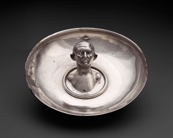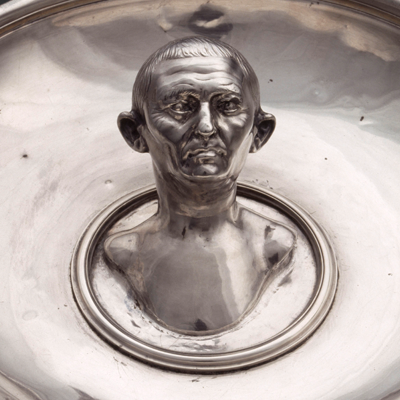 ポンペイの北西に位置するボスコレアーレは、紀元79年にヴェスヴィオ山の噴火で埋没した古代の小都市の一つです。1895年にヴィラ(古代ローマの上流階級の人々が田舎に建てた邸宅)が発掘され、樽に詰められた109点の銀器が発見されました。噴火の前に地中に埋められたため、きわめて保存状態がよく、その希少性から「ボスコレアーレの至宝」と呼ばれています。精妙な銀の打ち出し細工が施された酒盃や皿などの豪奢な銀器は、特別な饗宴の時に用いられ、客人をもてなすと同時に、一家の富を印象づける役割を果たしたのでしょう。この円形の杯の中央には、男性の胸像が裏側から立体的に打ち出されています。当初は女性の胸像が配された杯と対をなしていました。おそらく所有者か、彼らの祖先の夫婦を表すものと考えられています。祖先崇拝が行われていた古代ローマでは、祖先の胸像や立像、デスマスクや肖像画を家屋の中に飾る風習がありました。