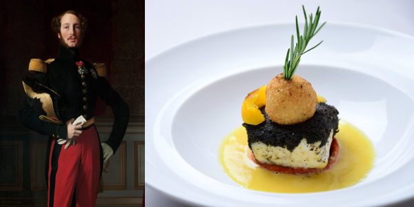 オルレアン公を象った一皿。ブラックオリーブのクルートで包んだスズキ、低温で焼いたトマトのセッシェに、とろけるにんにくピューレを忍ばせたコロッケを乗せて。オレンジ風味のブールブランソースを合わせて、夏らしい爽やかな味わいに仕上げています。