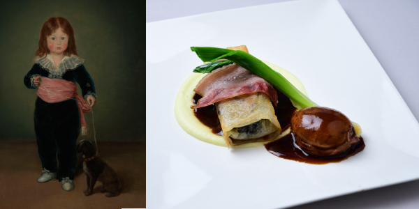 絵画をお皿の上で表現した一皿。赤ワインで煮込んだ牛ほほ肉と細かく刻んだキノコ炒めをパートブリックの包み焼きに。少年の帯をイメージしたベーコンを巻いて、じゃがいものピューレ、赤ワインで煮込んだ半熟卵を添えています。