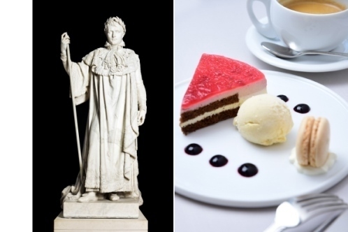 甘酸っぱいベリーのチーズケーキ、ヴァニラアイスクリームとマカロン。ナポレオン1世皇家の紋章のトリコロールカラーをモチーフに、3種のスイーツを一皿に。
